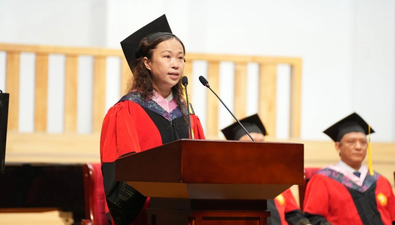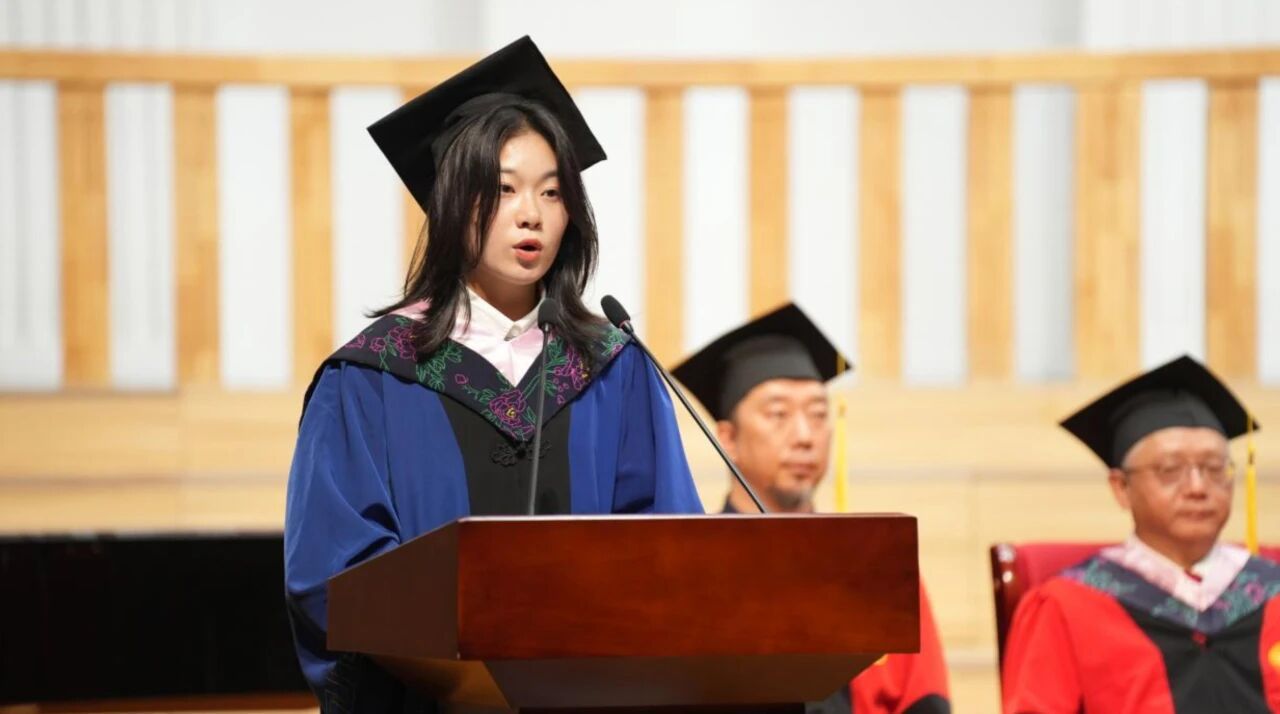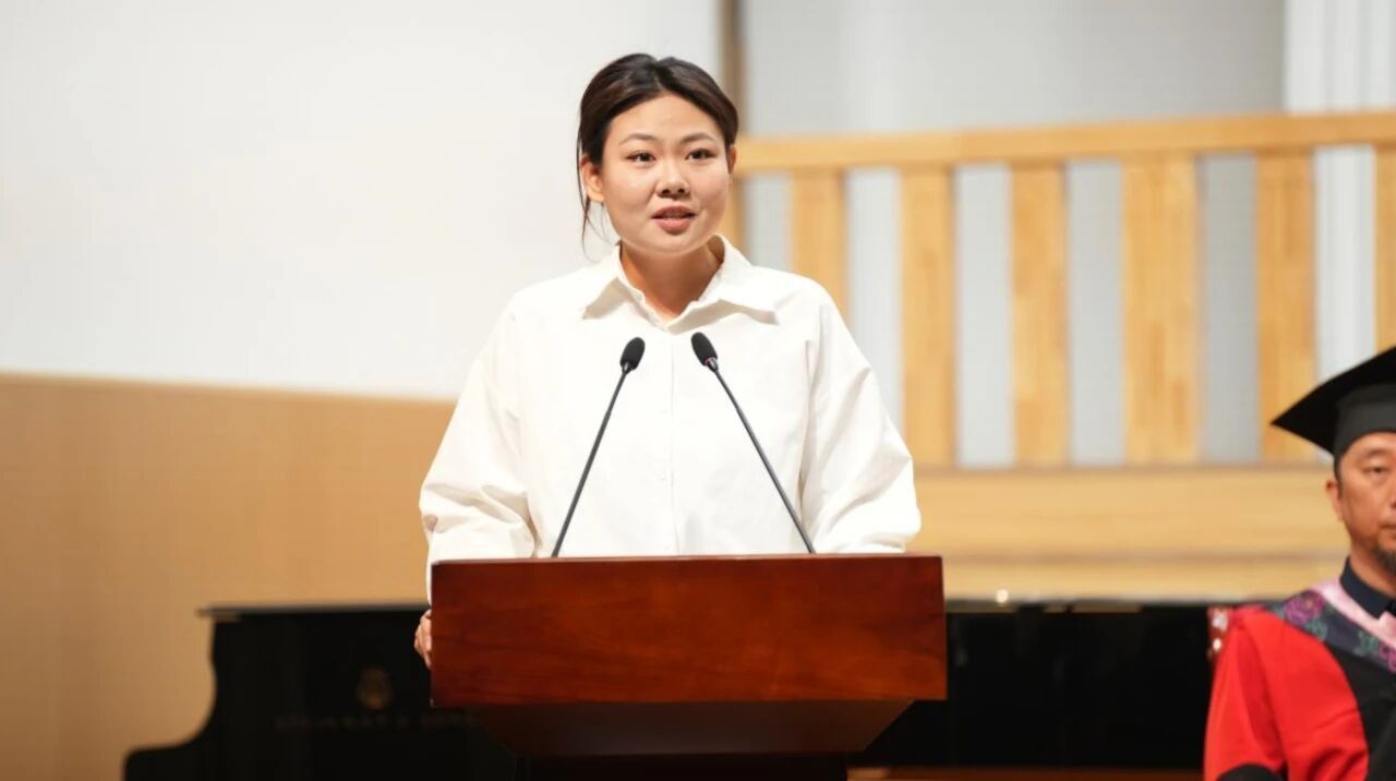 毕业生代表2022 级音乐专业张心雨在发言中回顾了研究生阶段的课程学习、学术研究和艺术实践经历,对学院的培养体系、导师的指导以及同窗的帮助表示衷心的感谢。