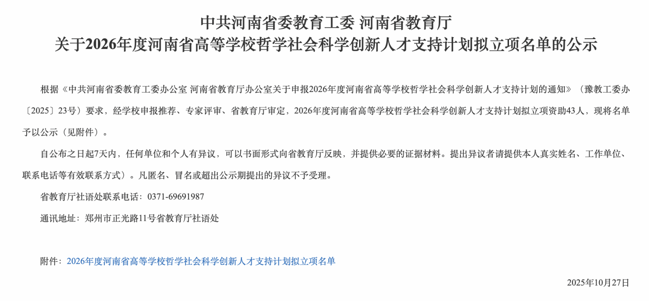 近日,河南省教育厅公布了“2026年度河南省高等学校哲学社会科学创新人才支持计划”拟立项名单,经个人申报、学校推荐、专家评审、省教育厅审定,本次计划拟立项资助43人,色情片