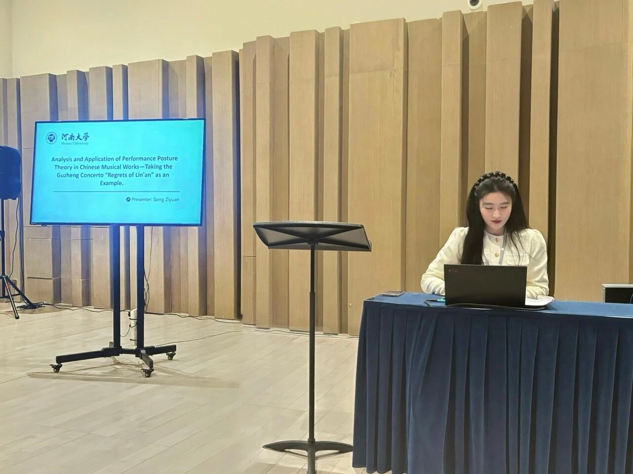 宋梓园,我院2025级音乐专业硕士研究生(音乐教育方向)。在会议中报告的题目是《Analysis and Application of Performance Gesture Theory in Chinese Musical Compositions: An Example from the Guzheng Concerto ‘Lin'an Remains Hate》。研究使用音乐表演姿态理论对中国音乐作品古筝协奏曲《临安遗恨》中的一个片段进行了可视化分析,旨在解释音乐表演姿态理论中四种姿态(音响生成姿态、音响辅助姿态、演奏交流姿态、音响伴随姿态)在表演过程中的具体表现。通过图表分析法,详细阐述了器乐演奏家、歌剧表演家和舞蹈家三种不同专业四种姿态的异同;通过物理软件Tracker,测量表演者身体头部运动并进行数据分析,得出了影响音乐姿态的因素,主要是与演奏的速度、力度和情感有关。该研究对音乐表演者、聆听者和教育者提供启示:表演者可以通过对音乐表演姿态理论的分析研究,从中找到自己的演奏个性,使舞台表演更加饱满丰富;聆听者可以通过音乐表演姿态理论来对表演者肢体动作进行分析,更好地理解乐曲的感情;教育者可以合理运用音乐表演姿态理论进行更加科学的、创新的教育教学。