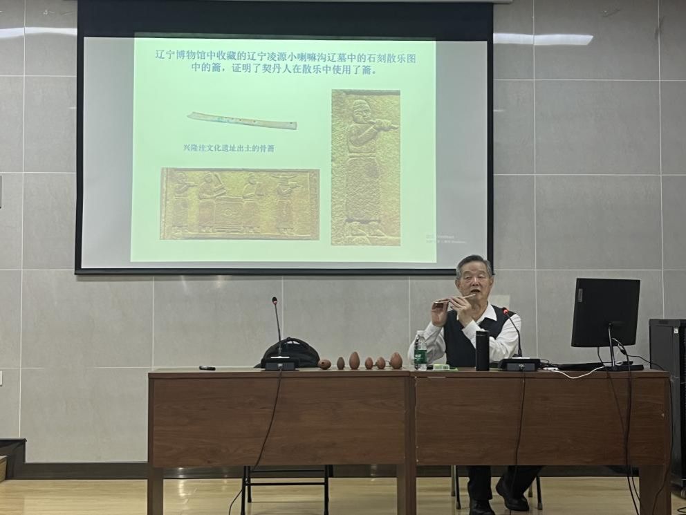谈及博物馆与文管会收藏的音乐类文物,陈教授首先以辽宁地方博物馆藏兴隆洼石埙为实例,结合自身实验考古的实践测音,指出并纠正了博物馆对该器物的误判。随后,他又以红山陶埙、辽代吹籥画像石、辽代乐舞图像等珍贵音乐文物为核心素材,系统阐述了中国古代音乐器物在形制设计与功能用途上的丰富性、多样性。同时,通过实物佐证,还原了文献中“籥”的历史使用场景,并进一步解读了辽宁双塔寺西塔所承载的梵文内涵与太阳、火崇拜的文化寓意。