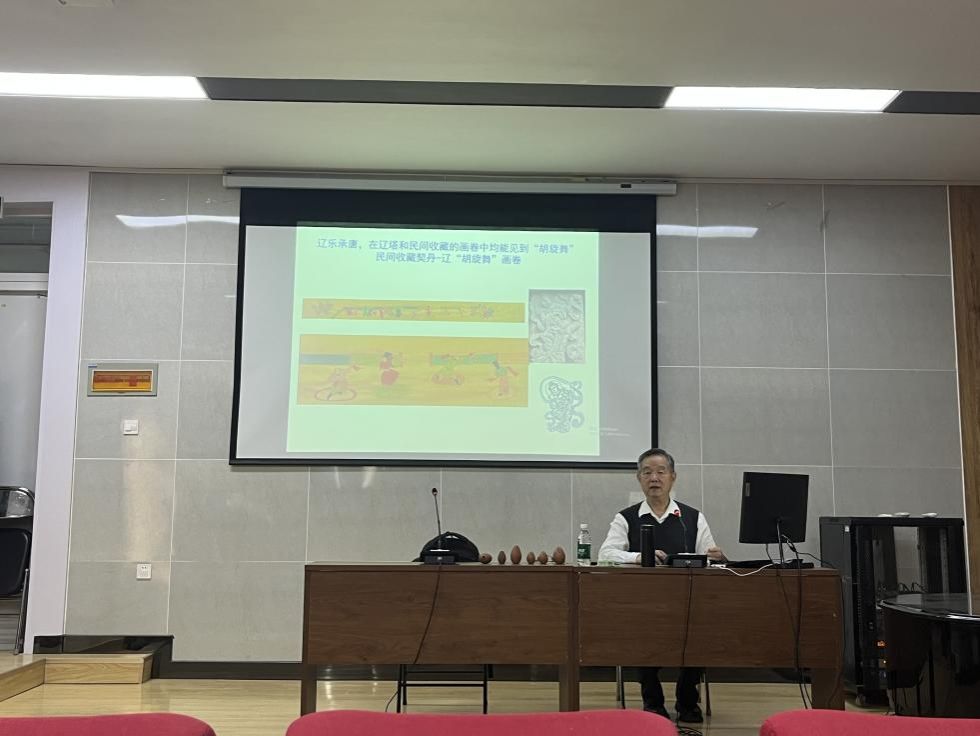 在第二部分,陈教授以“走出书斋,到田野中进行考察,获取第一手史料”为题,鼓励同学们多关注并发掘现存的各类音乐图像资料,拓展研究视角,将研究视野投向田野。陈教授结合个人摄影成果,以辽宁朝阳北塔、北镇西塔、云接寺辽塔等为例,深入解析不同佛塔中承载的音乐元素,以此提出琵琶与细腰鼓均为契丹族民族乐器的核心观点。在契丹音乐文化及乐器传承的探讨中,陈教授认为契丹族传承并发展了渤海国乐器“铣琴”。他通过展示朝阳姑营子辽墓中的弹铣琴石版画、敖汉博物馆收藏的《备猎图》等实物史料,直观呈现了辽代社会中铣琴的实际使用场景,为上述观点提供了有力支撑。针对寺院收藏的音乐史料,陈教授着重考察了辽上京开化寺的石经幢萨满图,这些图像线条鲜明、构图流畅,清晰呈现了辽代祭山仪与祭塔仪的画面场景,既是契丹—辽舞蹈形象在宗教艺术中的具象化呈现,也有效弥补了史书记载中辽代宗教音乐相关内容的缺失。