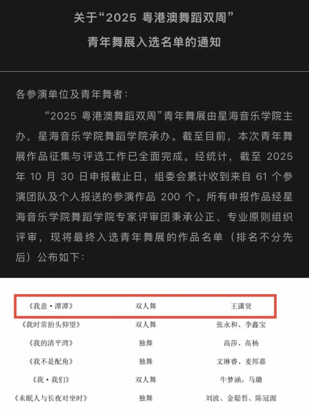 舞蹈学院组织专家评审团公正专业评审,最终确定入选名单。