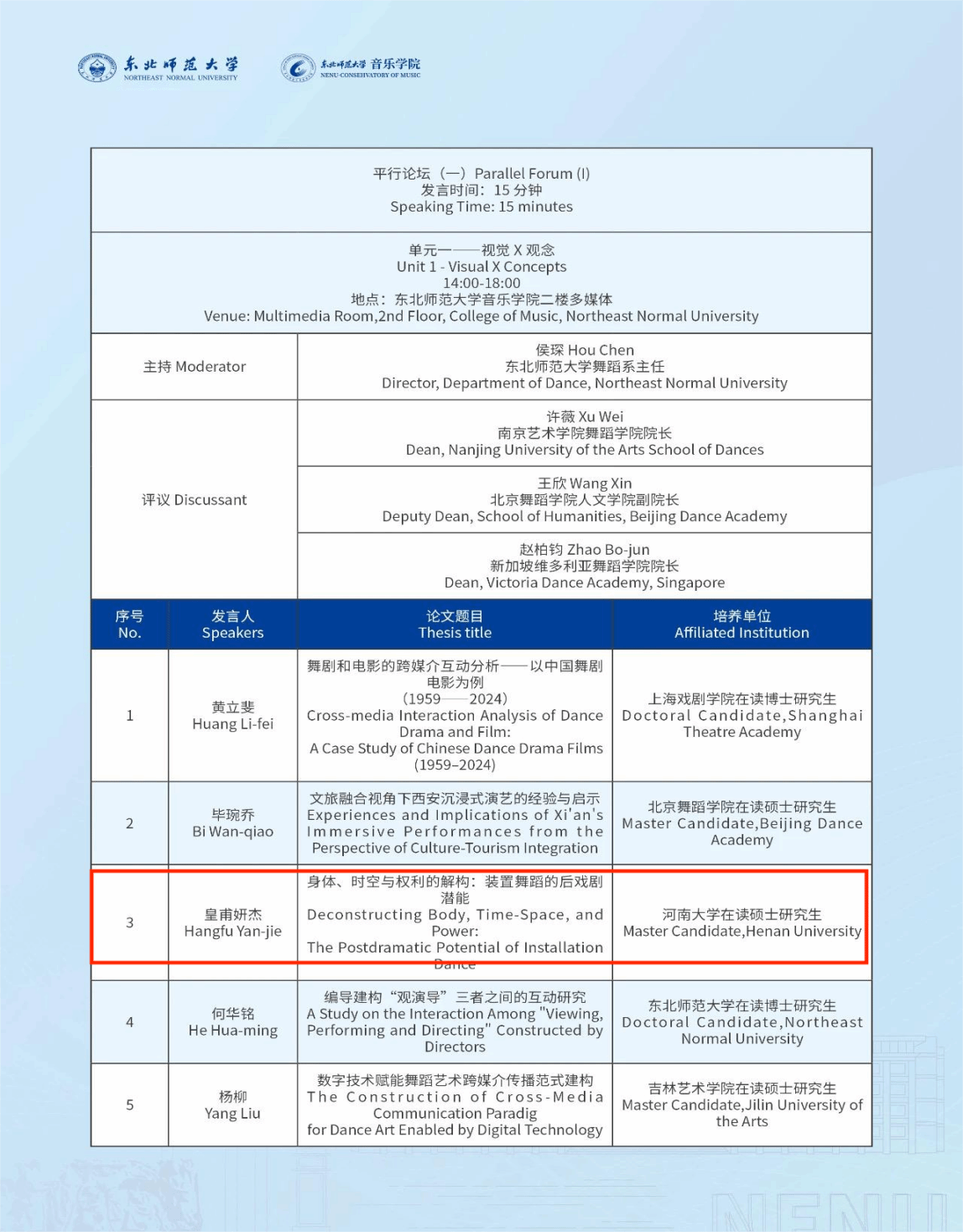 5月28日,我院舞蹈系中原文化舞蹈研究所副所长李佼佼老师指导的硕士研究生皇甫妍杰的论文入选2025舞蹈学科硕博国际学术论坛。