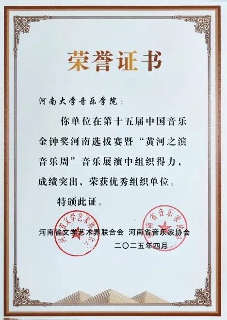 由河南省文学艺术界联合会、河南省音乐家协会共同主办的第十五届中国音乐金钟奖中我院成绩斐然:一等奖 8 人,二等奖 10 人,三等奖12人,优秀指导老师奖5人。