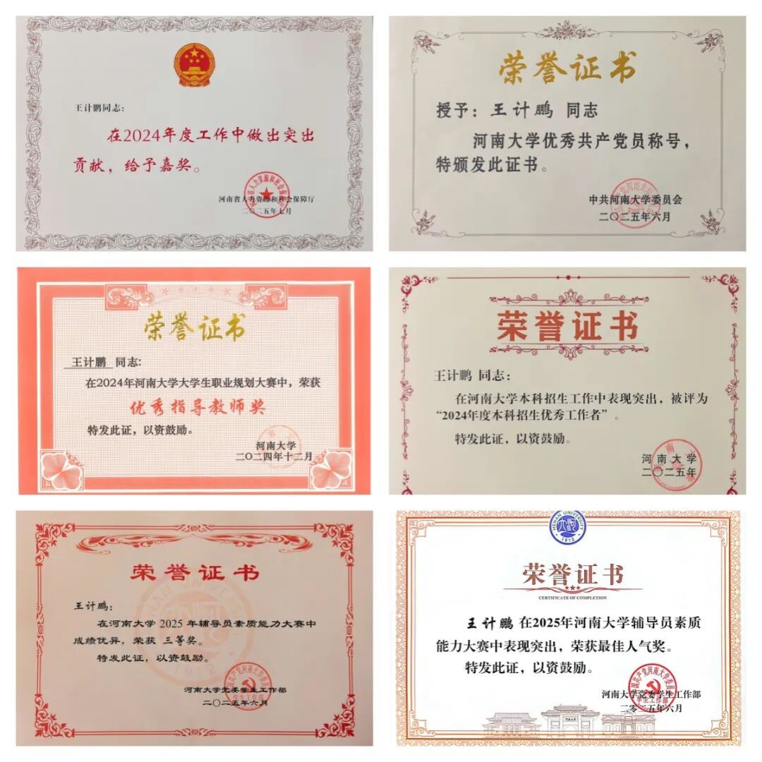 “优秀共产党员”、大学生职业生涯规划大赛“优秀指导教师”、征兵工作“先进个人”、本科招生“优秀工作者”等荣誉称号